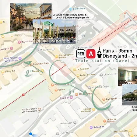 Il y a les Princess Pavilion à environ 3 km de l'appartement. L'hébergement est niché à côté du Centre Commercial Val d'Europe.